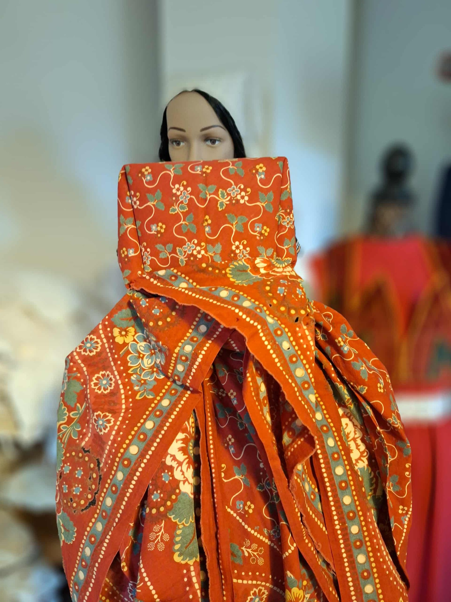 Tento šátek má krásný vzor, stáří se odhaduje na cca 1940, je restaurovaný, nově uvázaný "dolú rožky".
