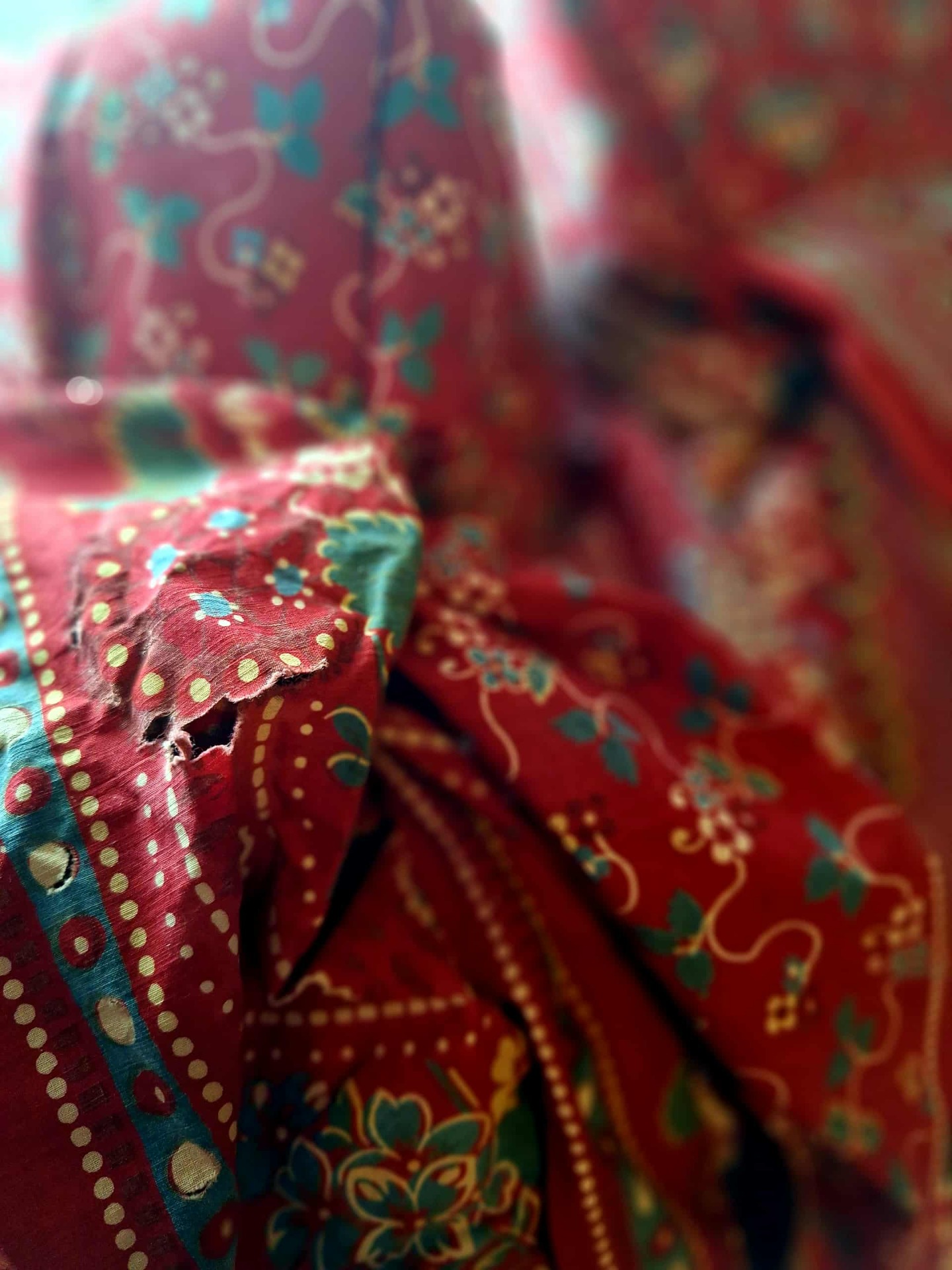 Vady: při restaurování vypadaly některé tmavé kvítky, je zažehlený, aby dírky neprosvítaly.