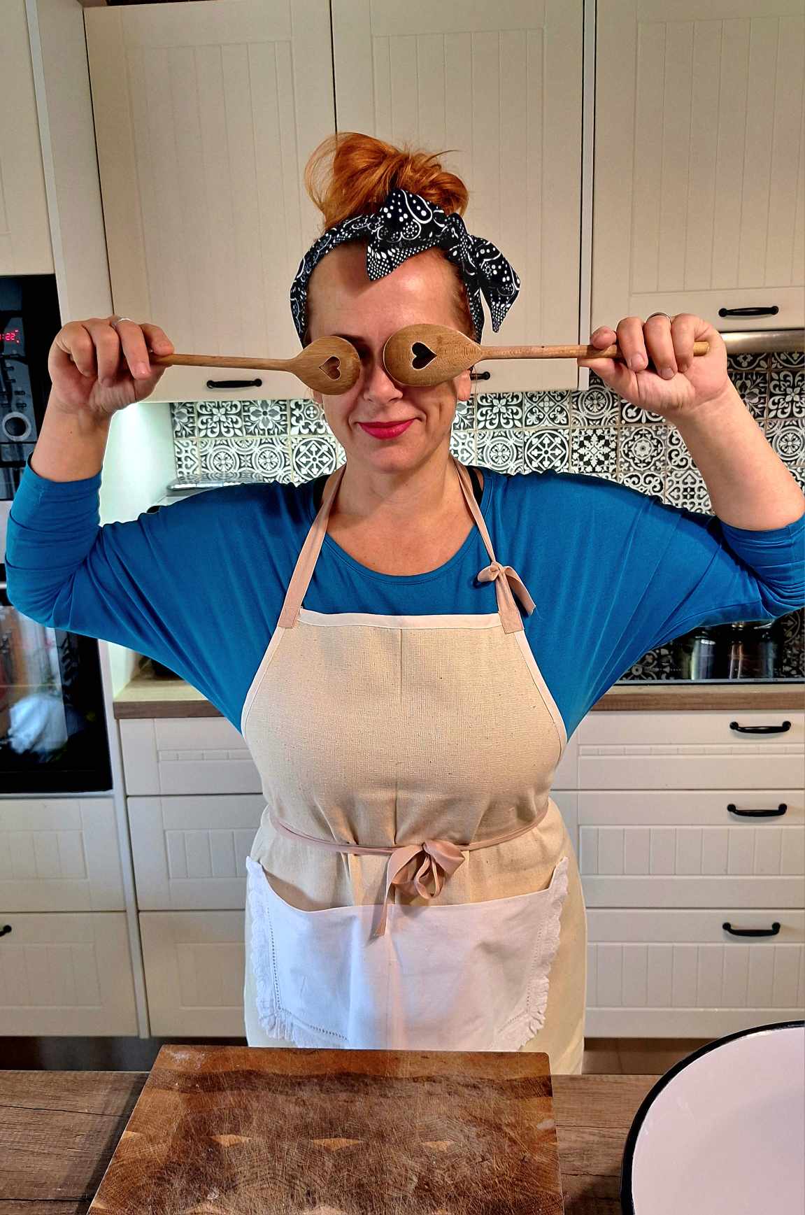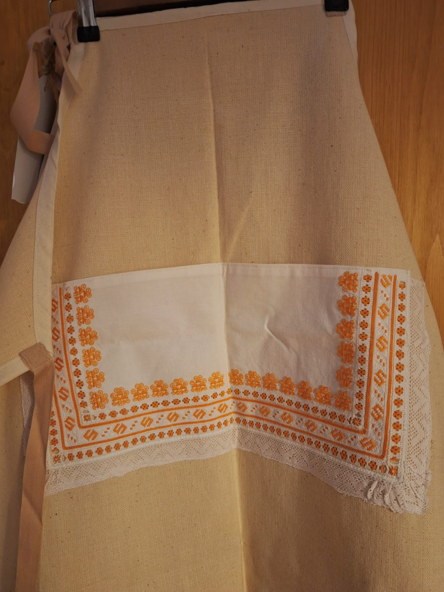 V kuchyni Vám to bude slušet v naší nové režné zástěře, zdobené kapsou pěkně v horňáckém folklorním stylu, ze starého obojku s jemnou výšivkou a čipkou.